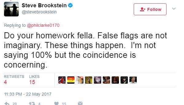 Enquanto isso no Twitter, Steve Brookstein, estrela do programa The X Factor da TV britânica, escrevia: “False Flags não são imaginários. Essas coisas acontecem. Não estou 100% certo, mas as coincidências são preocupantes”. Não precisa dizer que a reação de colegas na grande mídia foi de acusa-lo de “desrespeitoso” e um “teórico da conspiração doente”.