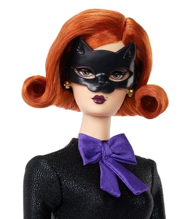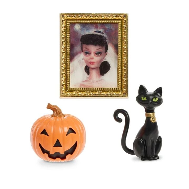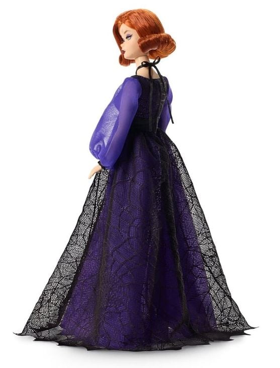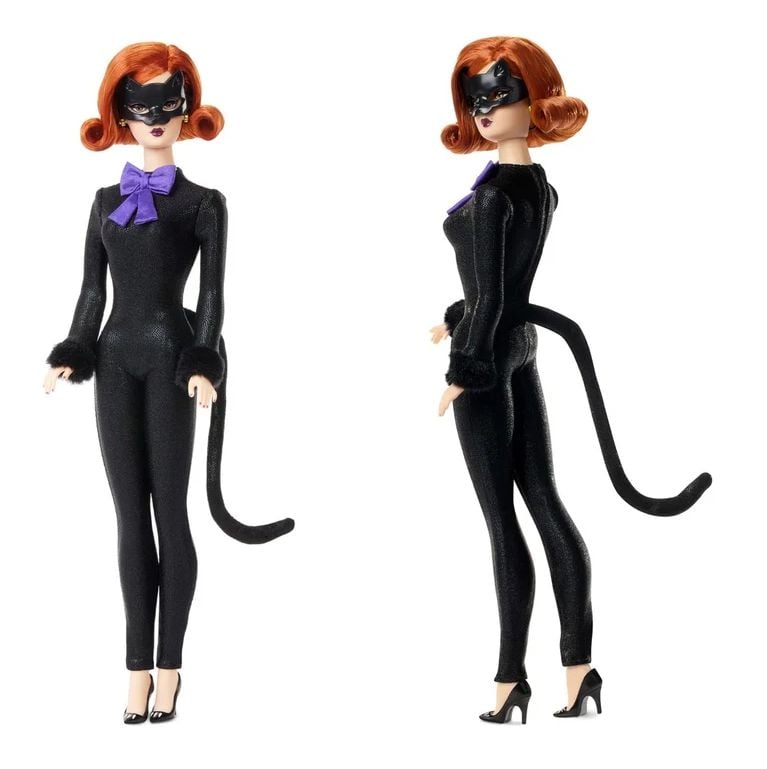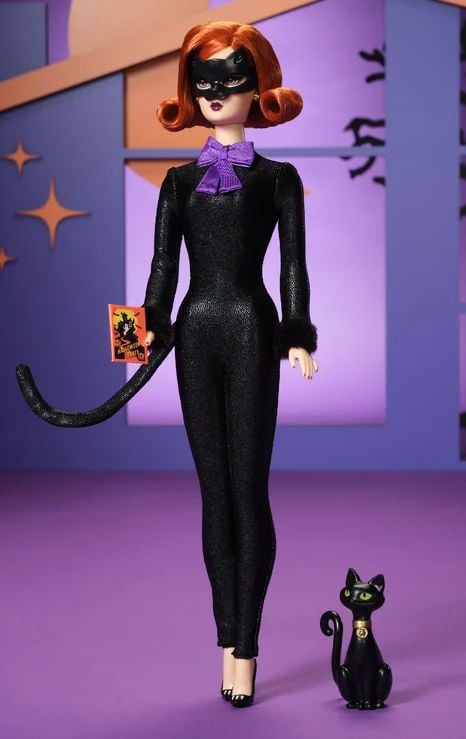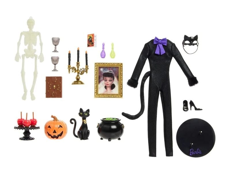 A estrela do pacote é uma Barbie vestida com um traje dramático de bruxa, saia de renda com motivos de teia de aranha, salto alto e uma manicure vermelha. Mas a magia não para por aí. Os colecionadores têm a opção de reposicioná-la em uma segunda fantasia, um corpo de gata estiloso, para variar o visual.
