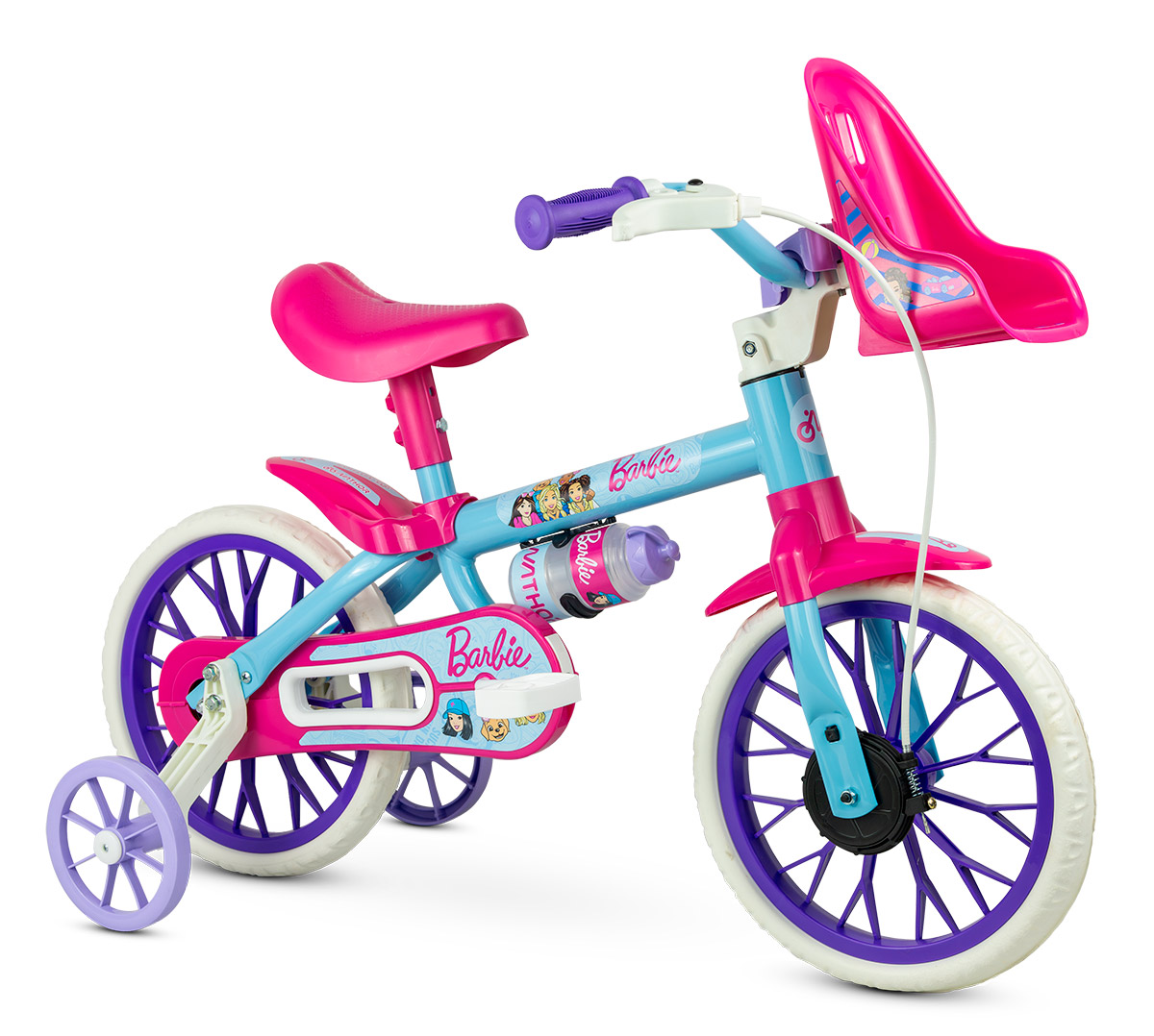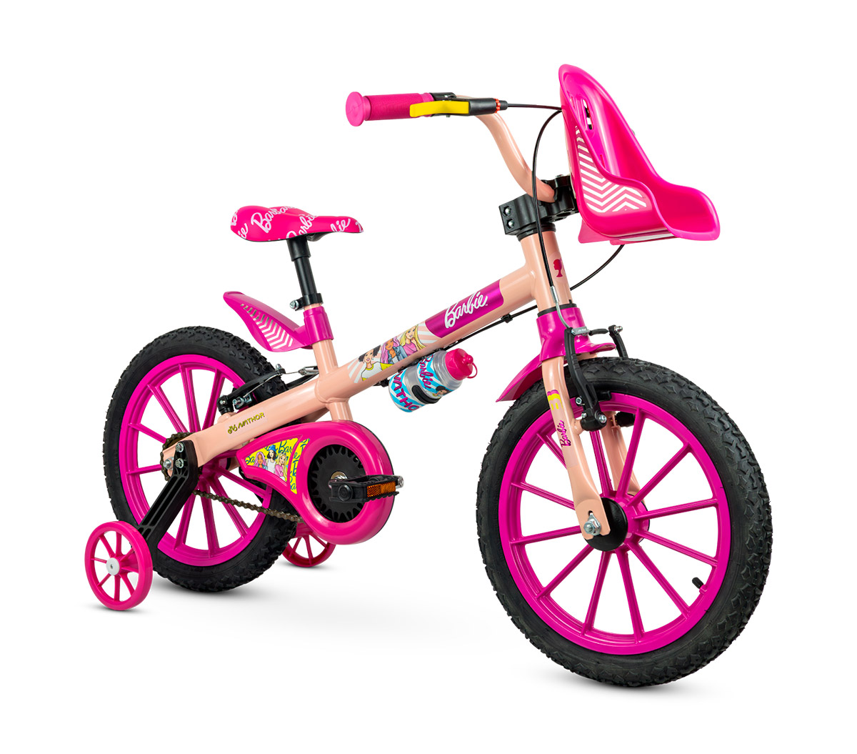 Para crianças a partir de 5 anos (1,10 m a 1,20 m), os modelos aro 16 trazem aro em ABS, rodinhas laterais removíveis e freio com maçaneta amarela para facilitar a identificação. A regulagem de ângulo do guidão permite ajustes que proporcionam mais conforto para a criança e acompanham seu crescimento. A versão Barbie também conta com suporte para boneca, reforçando a conexão afetiva com a personagem e estimulando ainda mais a imaginação durante as pedaladas.