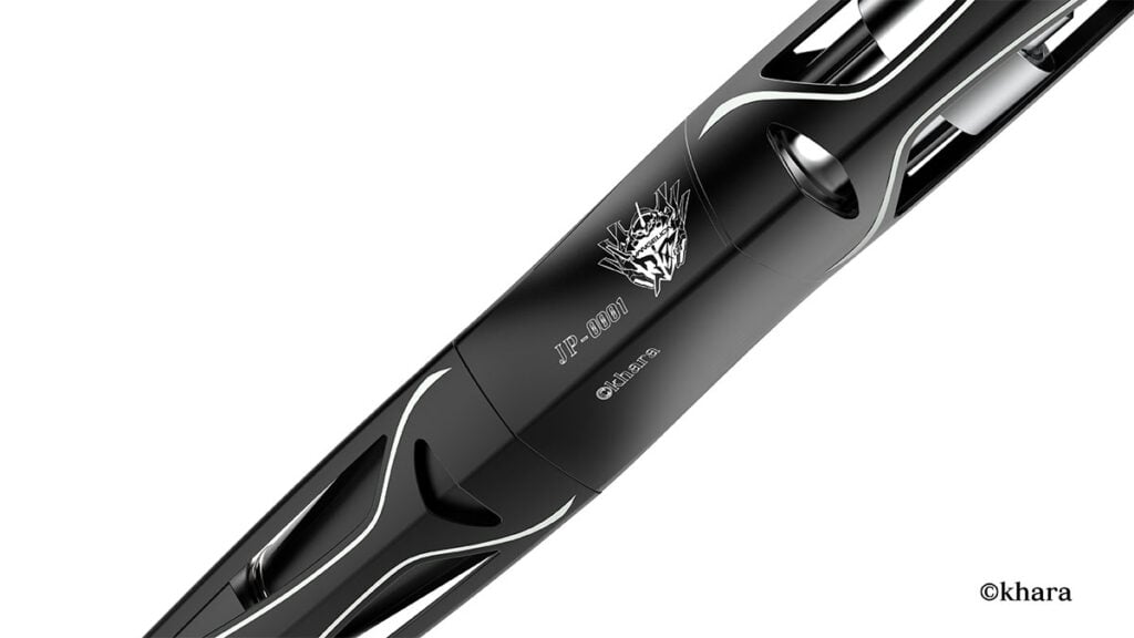 A parte de tinteiro recebe atenção especial: o bico tem banho de 24K e traz o logo da NERV gravado a laser, enquanto o corpo matte carrega o emblema comemorativo de 30 anos e um número de série exclusivo.