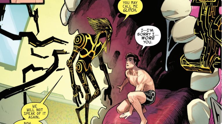 Durante uma luta intergaláctica para ajudar Rocket Raccoon a pagar uma dívida absurda, sim, o universo Marvel nunca perde o humor, o Aranha percebe que há algo de errado com o traje. Ao reativá-lo, Peter tem sua mente conectada à do ser alienígena e descobre sua origem: Glitch era parte da raça Technarchy, mas rompeu com a consciência coletiva e passou séculos em isolamento antes de ser transformado em uma arma viva pelo cientista. Ao despertar totalmente, o alienígena assume o próprio nome e decide não mais se submeter a ninguém.