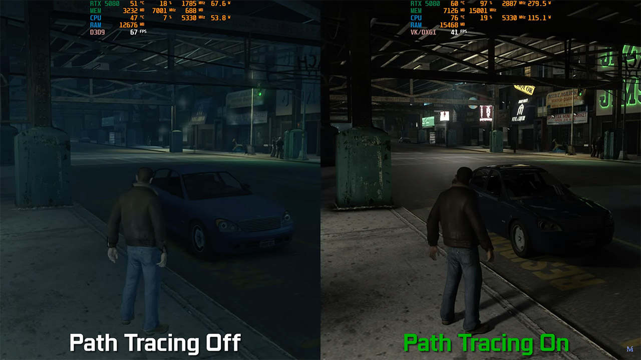 Claro que toda essa beleza tem um preço. Rodar o jogo em 4K com uma RTX 5080 exige força bruta, e mesmo assim, o desempenho pode cair para 35 a 45 quadros por segundo em áreas mais movimentadas. O path tracing é pesado, e GTA IV já era conhecido por ser exigente com o processador. Usar DLSS 4 no modo de performance ajuda a alcançar algo entre 55 e 85 fps, e com frame generation, o jogo chega facilmente a mais de 100 fps, segundo análises do Digital Foundry.