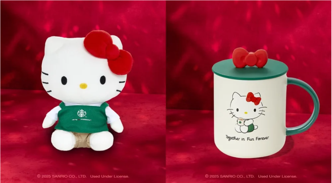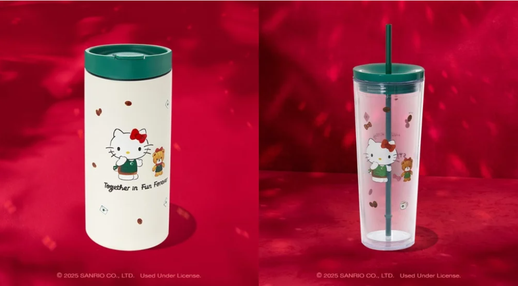 Entre os itens da linha estão uma pelúcia da Hello Kitty vestida com o avental verde da Starbucks, canecas de cerâmica com o icônico laço vermelho da personagem, copos de acrílico, garrafas de aço inox e tumblers estampados com Tiny Chum, o inseparável ursinho da Hello Kitty. A estética é toda voltada para o Natal, com tons de vermelho, rosa e ilustrações inspiradas em café. Os preços variam entre US$ 29,95 e US$ 34,95, e os destaques são a caneca de 473 ml, o copo frio de 769 ml em aço inox e o copo acrílico de 710 ml.
