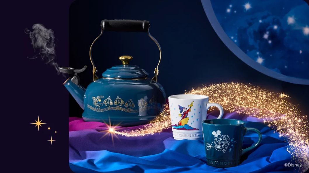O destaque fica por conta da Every Rice Pot de 18 cm, uma panela com acabamento em ferro fundido, puxador em forma de estrela dourada e o contorno de Mickey gravado na tampa. A linha também inclui canecas, mini travessas, caçarolas e até um bule apito, todos com detalhes inspirados nas cenas e símbolos de Fantasia.