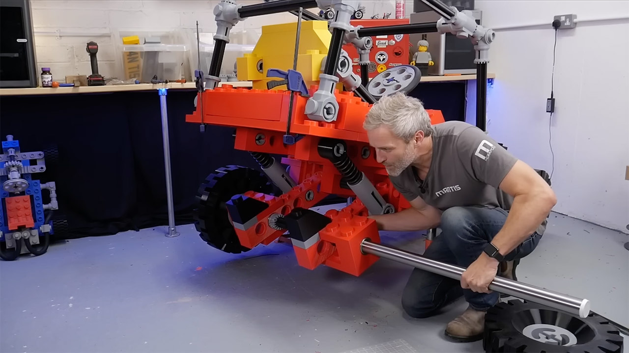 Para criar essa versão gigante, Denton precisou converter toda a estrutura para funcionar com rolamentos de eixo de 50 milímetros, o que resultou em um “LEGO” do tamanho de um kart.