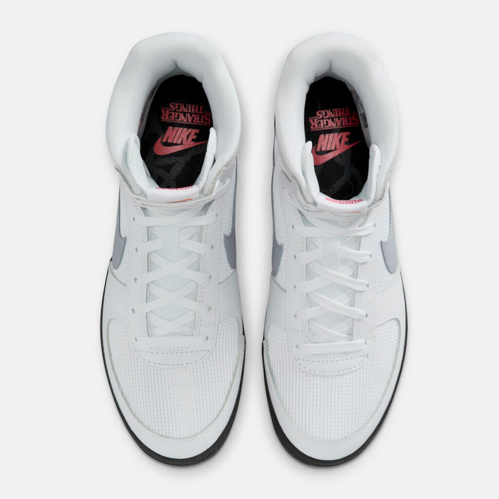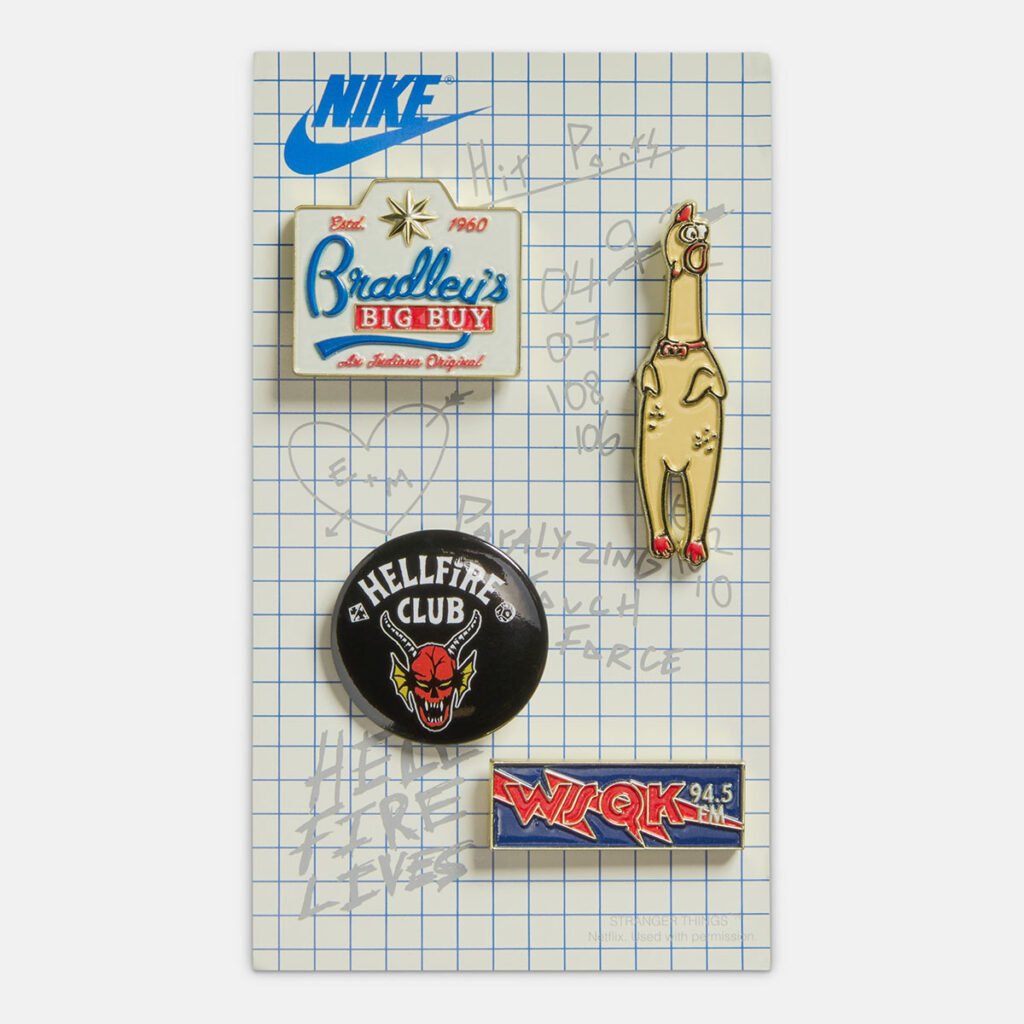 Os detalhes se acumulam de forma intencional, com pingentes temáticos, o símbolo do Demogorgon no patch clássico, nomes ligados ao Hellfire Club, cadarços personalizados e até uma placa do Mundo Invertido. Sim, um chaveiro de galinha de borracha também aparece, porque Stranger Things continua sendo Stranger Things.