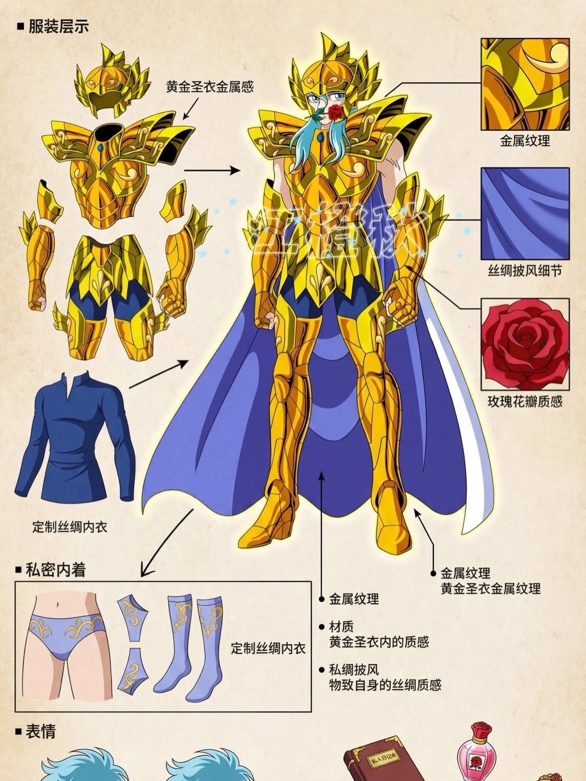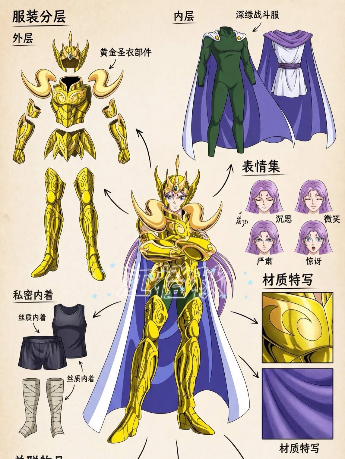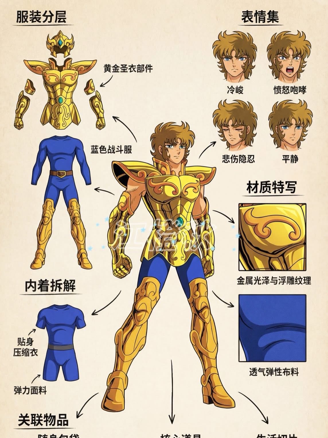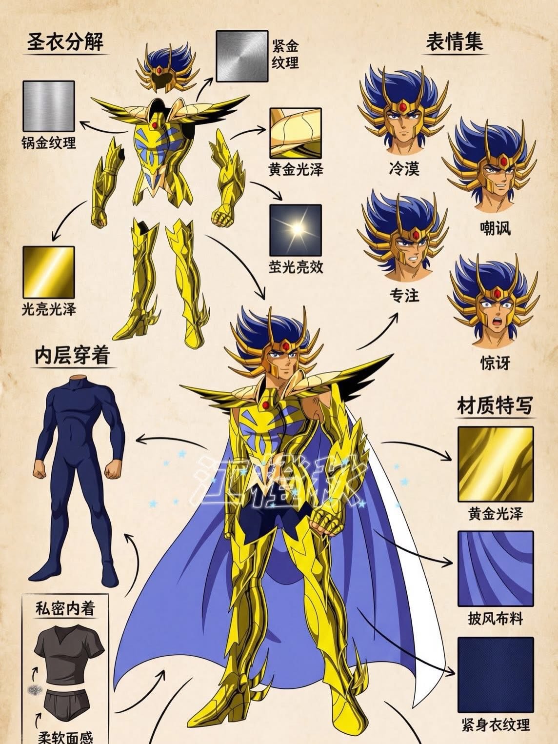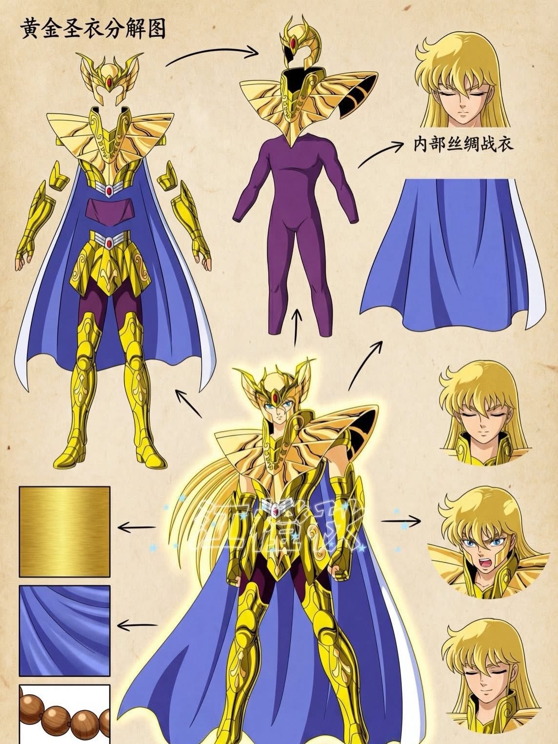 É quase como se víssemos um guia de bastidores, revelando camadas de roupas internas, texturas, expressões e até acessórios que compõem o visual final de cada Cavaleiro.