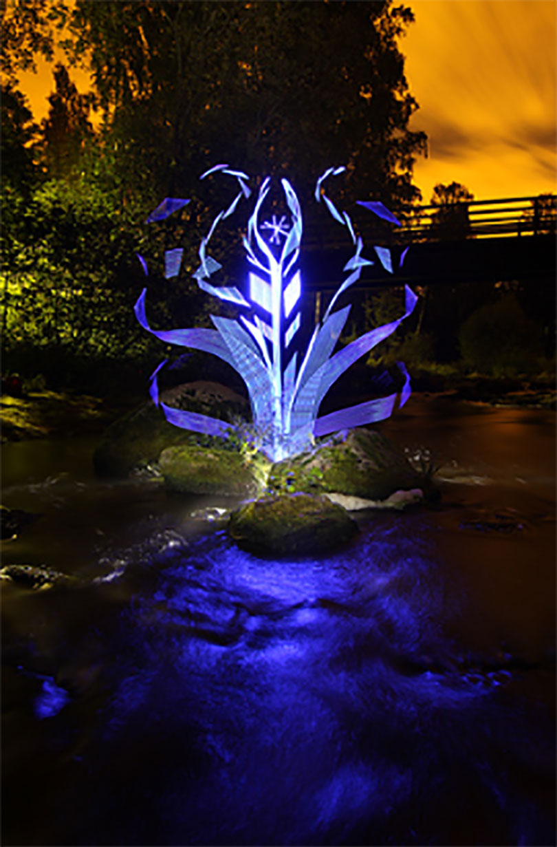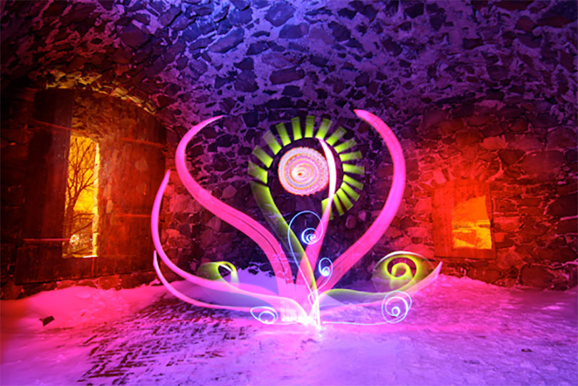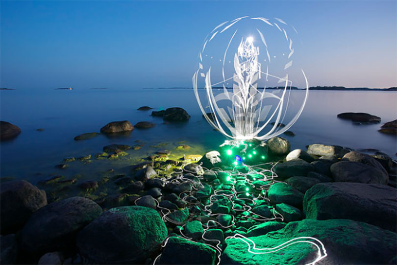 O artista finlandês Hannu Huhtamo pinta com luzes usando a técnica de fotografia de longa exposição.