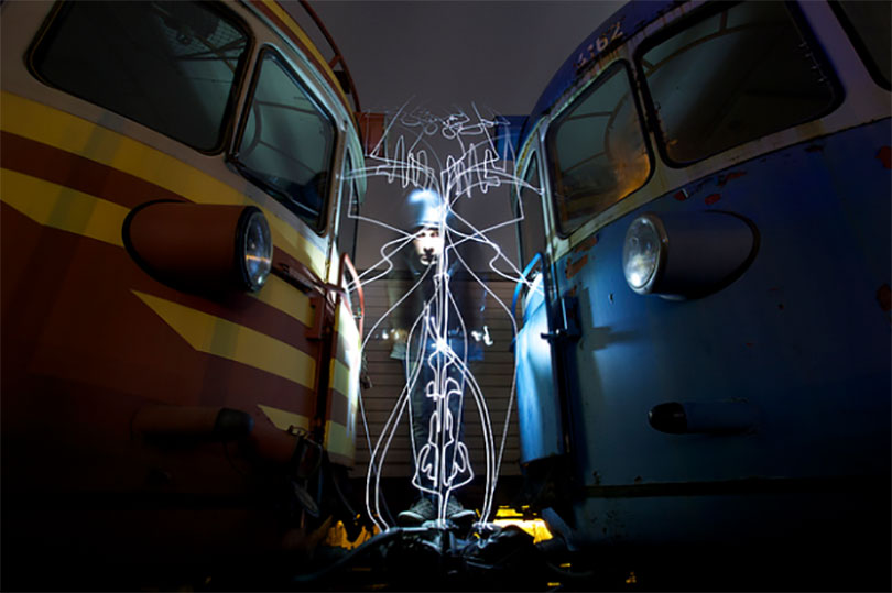 Ele desenha alguns esboços primeiro, avalia os detalhes que quer enfatizar do lugar onde será feita a arte, e diz que o tempo de exposição pode variar entre segundos e horas.