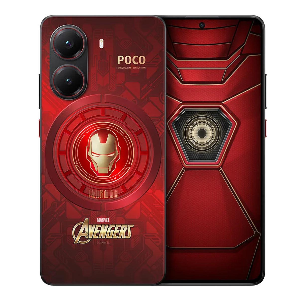Se você já sonhou em ter um pedacinho de tecnologia com cara de Tony Stark, a Poco atendeu ao desejo com a edição Poco X7 Pro Iron Man, um lançamento do ano passado que ainda chama atenção pela pegada estética. Por fora ele é basicamente o mesmo topo de linha que conhecemos, mas com acabamento vermelho e dourado inspirado na armadura do herói: a traseira traz um padrão mecânico em tons escuros com um desenho que remete ao reator arc, preenchido por nuances que mudam conforme a luz, anéis vermelhos ao redor das câmeras e logos da Marvel combinando com o branding da Poco. A interface também ganhou um tema exclusivo que fecha o visual da colaboração com a franquia.