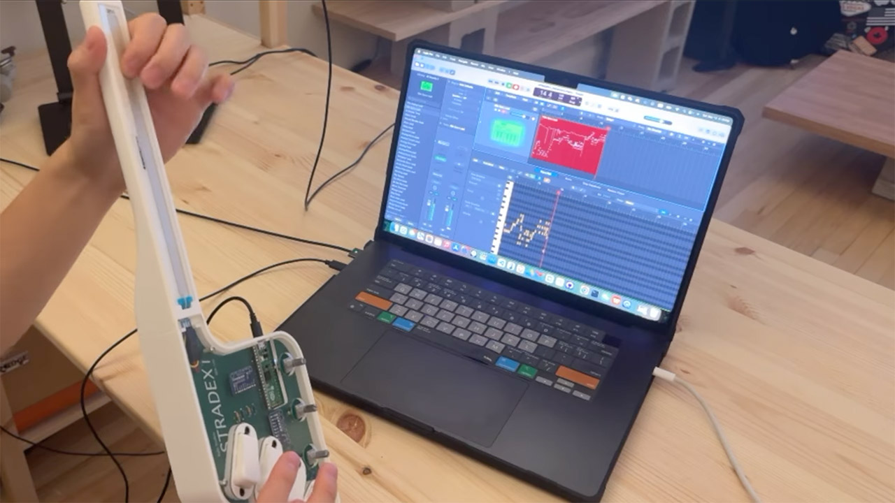A grande revolução do Stradex1 está em como ele captura a expressividade de um violino de verdade. Lin substituiu os botões rígidos de sua versão anterior por uma fita sensível de 8,5 polegadas, que envolve o braço do instrumento como um espelho de um espelho de um braço real. Ao deslizar os dedos por essa superfície, o sistema detecta a posição com uma precisão incrível de 32.000 graduações.